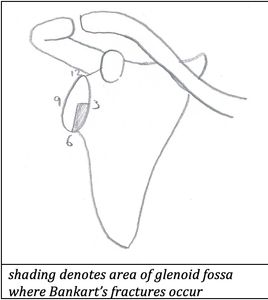 Classically the Bankart’s lesion is described as separation of the joint capsule and/or labrum from the anteroinferior glenoid rim, however the term is commonly used to refer to bony disruption of the glenoid – the bony Bankart’s lesion or Bankart’s fracture. This fracture occurs in approximately 22% of anterior dislocations and is the result of impaction of the humeral head against the antero-inferior glenoid labrum during dislocation, and is associated with rupture of the joint capsule and inferior gleno-humeral ligament damage. This is usually seen as a subtle lucent line in the antero-inferior ‘3-6 o’clock’ area of the glenoid with an adjacent fracture fragment.