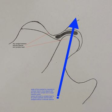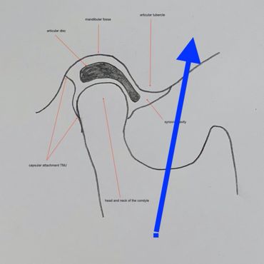 This is designed to ease the condylar head back onto the articular tubercle and then angle it backwards, allowing it to slide back behind the tubercle. Pulling down will simply activate further spasm of the aster and be counter-productive resulting in an upwards pull of the head.