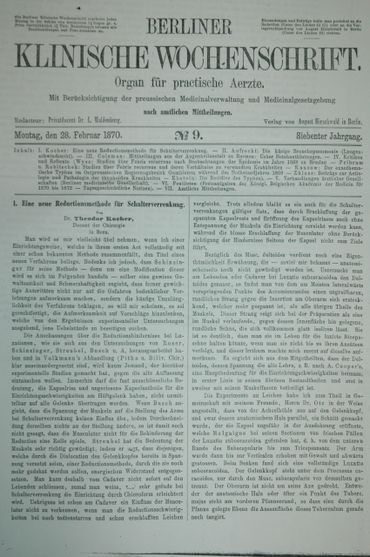 Kocher, Theodor: “Eine neue Reductionsmethode für Schulterverrenkung“,Berliner Klinische Wochenschrift, vol 7, issue 9, 28 Feb 1870, 101-105.