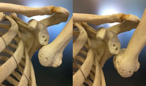 The humeral head sits beneath the glenoid rim with the greater tuberosity wedged underneath the rim. This results in the scapula tip winging out laterally and any movement of either humerus or scapula will see the other moving in tandem due to the fixing of the humeral head beneath the rim.