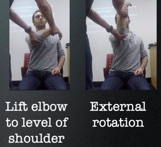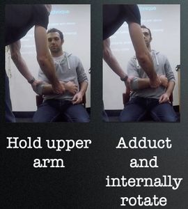 Note - if the scapula starts to protract (rotate forwards around chest wall) then you will need to move the elbow slightly across the front of the torso in order to maintain adduction and keep the head at the posterior glenoid rim. If you don't do this, it will stay wedged behind the rim.