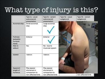There is a fullness visible and palpable anterior to the shoulder. This is the humeral head and fits with a Type II (subcoracoid) rather than a Type II (subglenoid) dislocation where the fullness would be felt in the axilla.