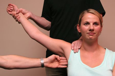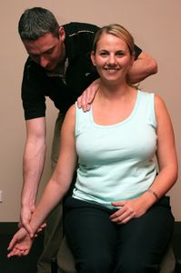 Sit your patient in a hard backed chair (with no wheels), stand behind the affected limb. Place your left hand over the trapezius and spine of scapula - this fixes the scapula and informs you of any scapular movement during the procedure.